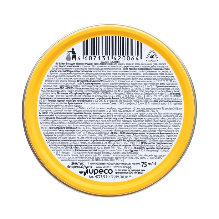 Защищает обувь от негативного воздействия влаги. Воск смягчает и питает кожу, предотвращая появления трещин.