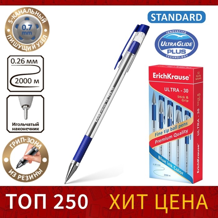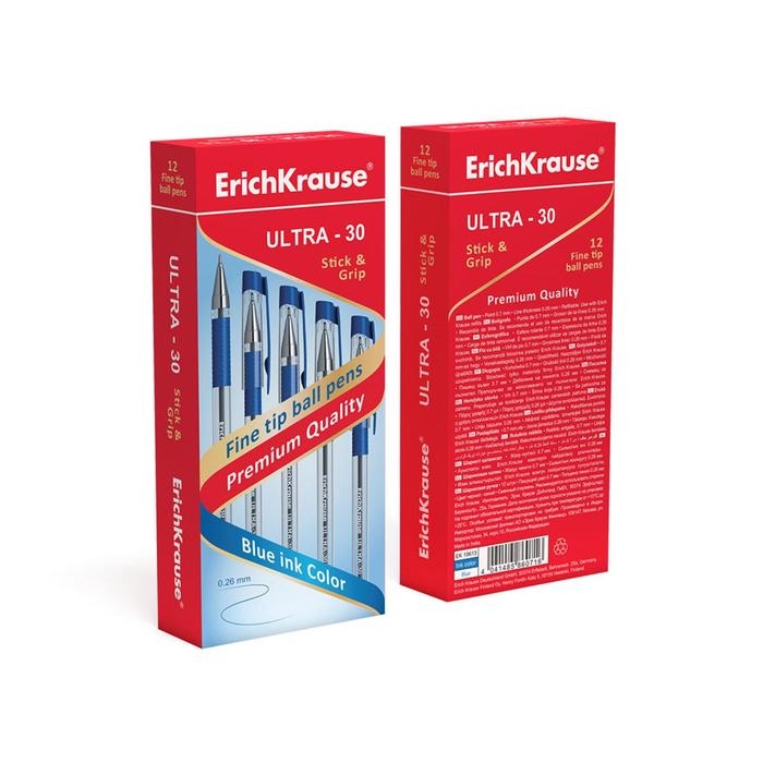 Ручка шариковая ErichKrause ULTRA-30, узел-игла 0.7 мм, чернила синие, резиновый упор, длина линии письма 2000 метров