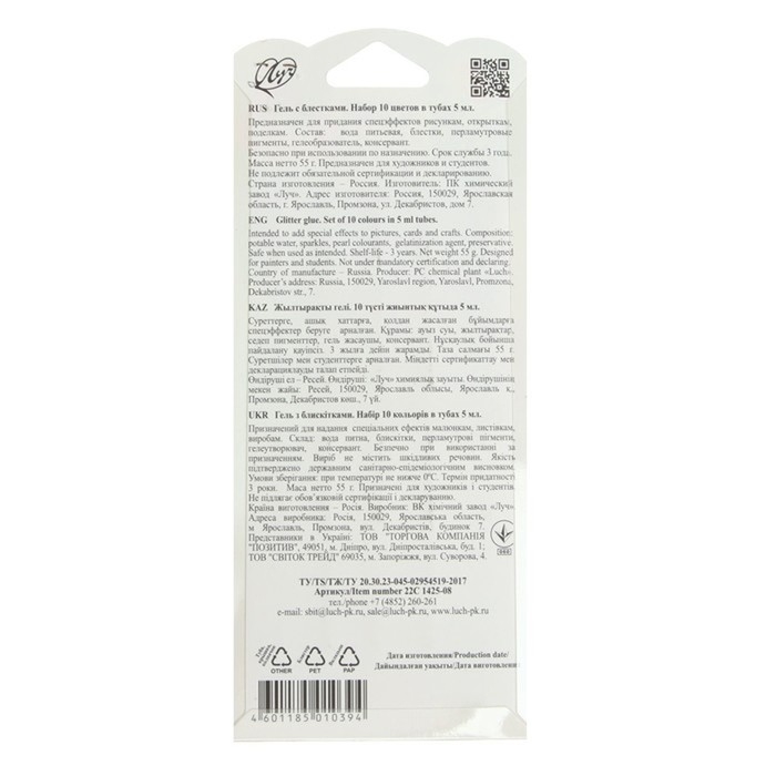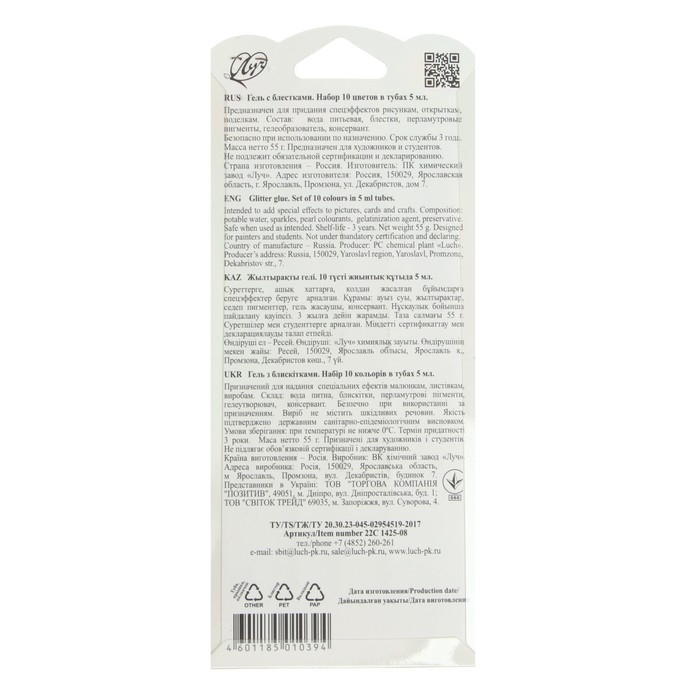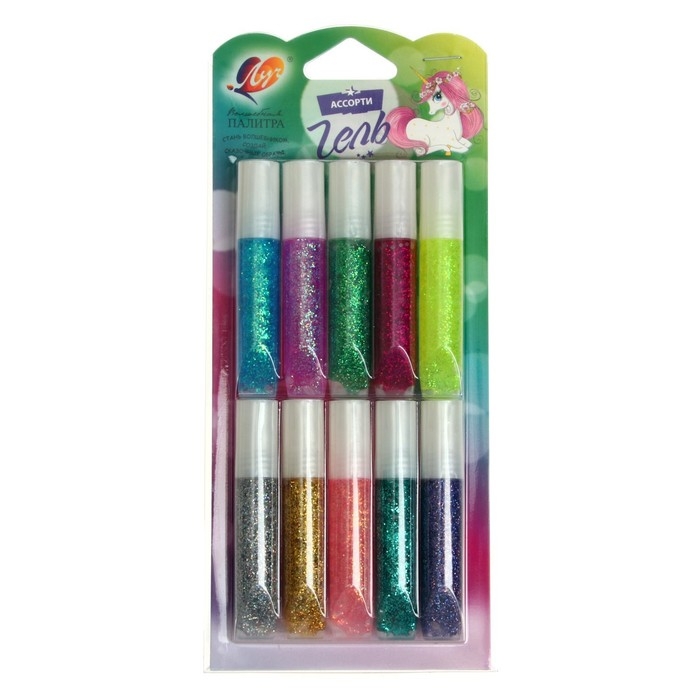 Гель с блёстками "Луч", 10 цветов х 5 мл, "Блеск"