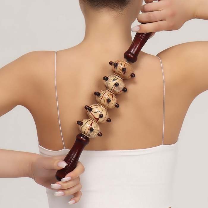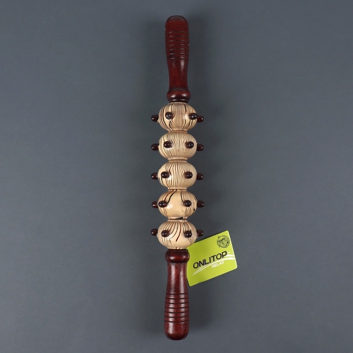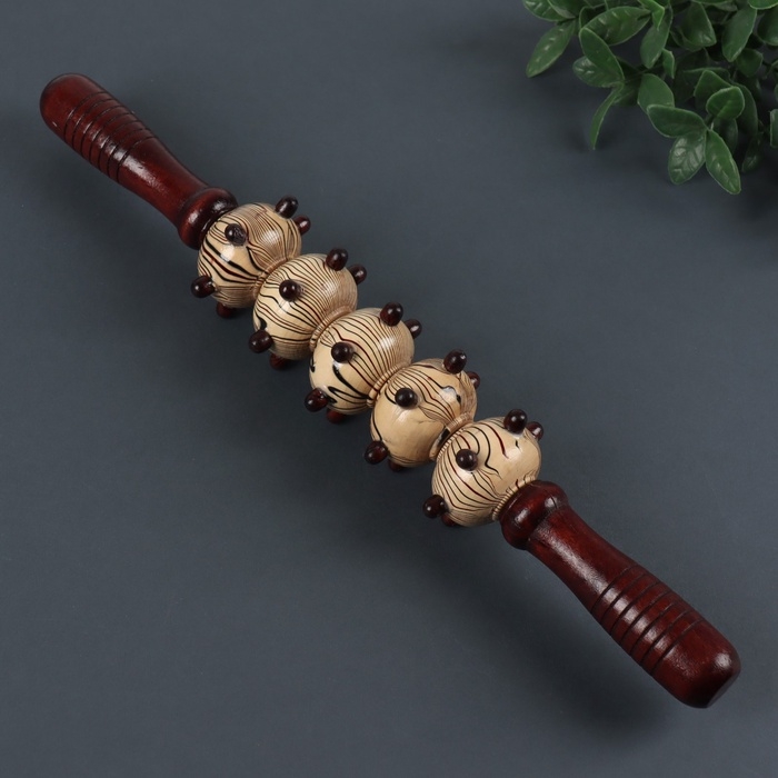 Массажёр «Скалка», универсальный, 36,5 × 5,8 см, 5 шаров с шипами, деревянный
