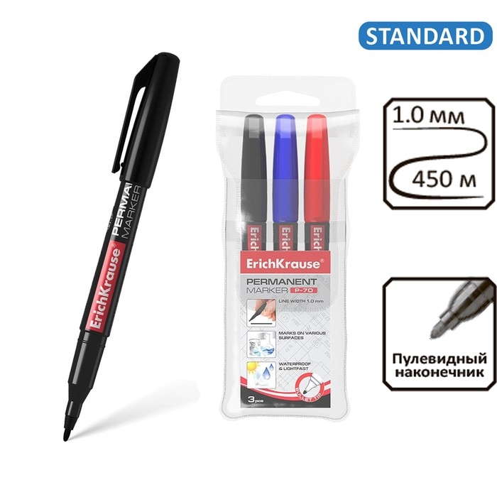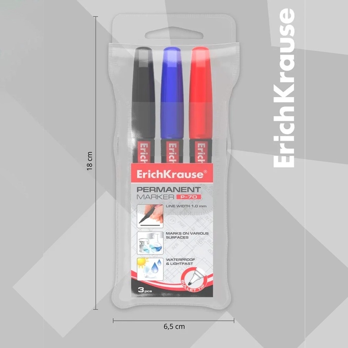 Набор маркеров перманентных 3 цвета, 1.0 мм, ErichKrause P-70, микс