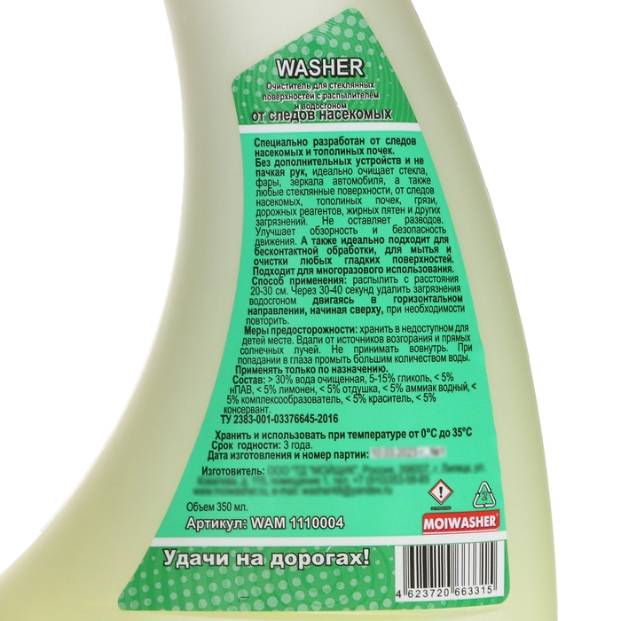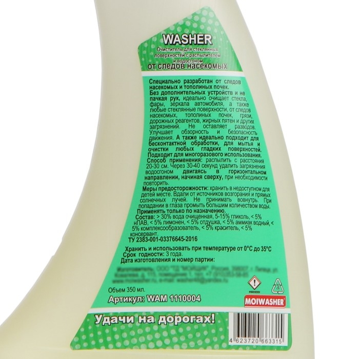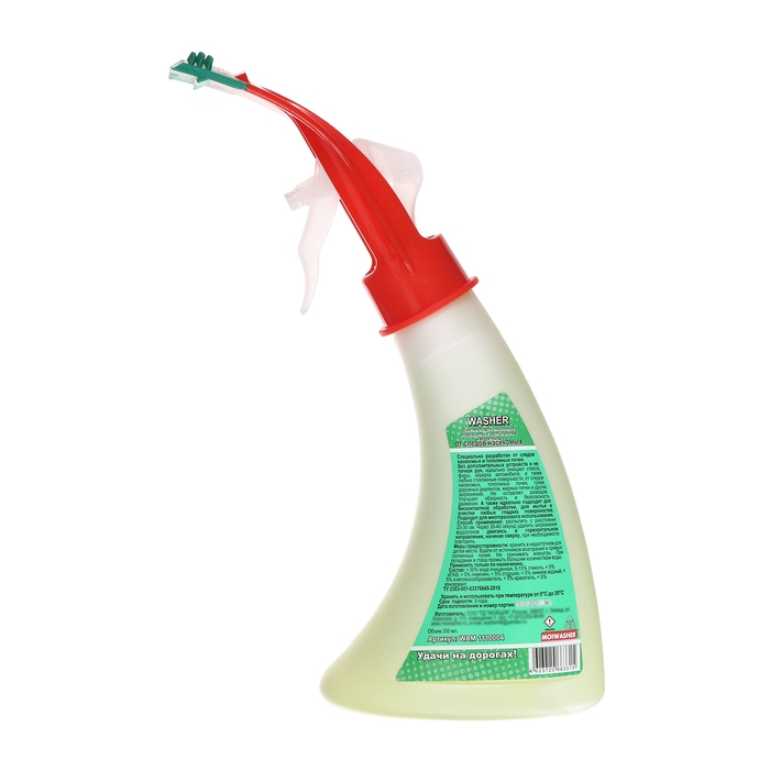 Средство для мытья стёкол с водосгоном «Мойщик» с лёгкостью удалит следы от насекомых и тополиных точек. Не пачкая руки, вы без всякого труда очистите стёкла, фары и зеркала автомобиля.