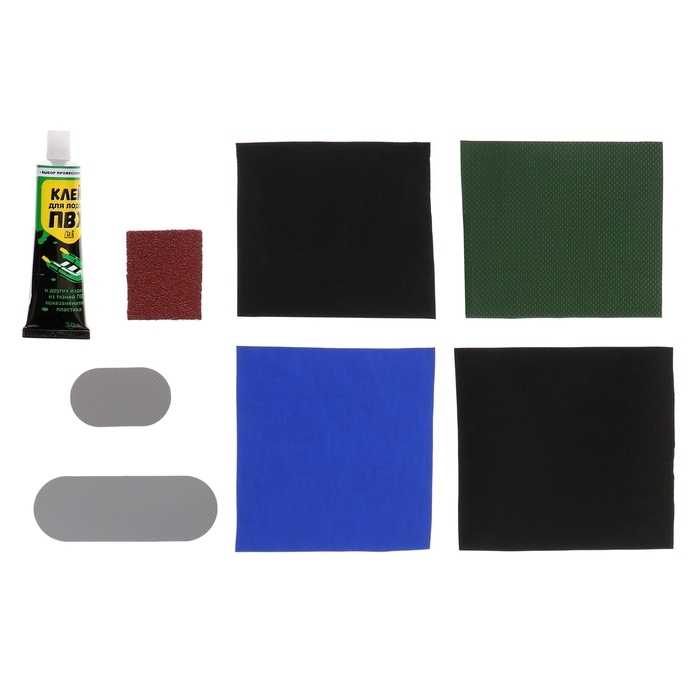 Какой бы прочной ни была ваша лодка, ей может понадобиться срочный ремонт. Материал ПВХ достаточно неприхотлив, поэтому его починка не составит особого труда. В комплект входят заплатки разных оттенков, наждачная бумага и тюбик клея (30 мл). Весь набор помещается в удобном для хранения и переноски тубусе.