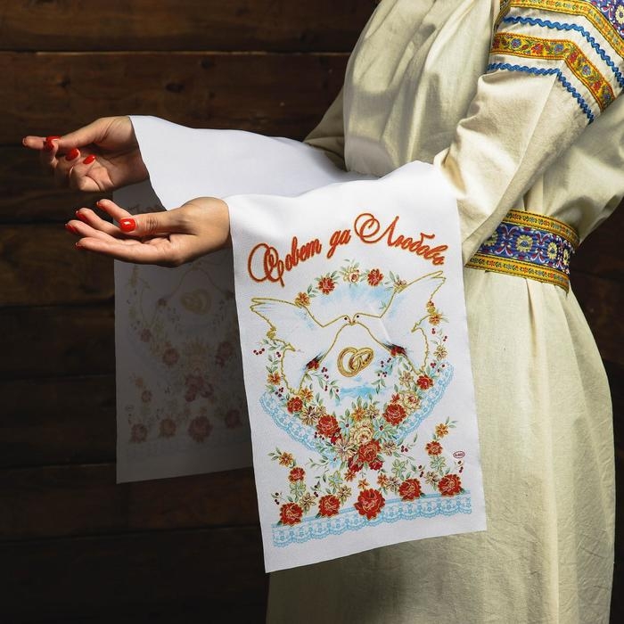 Рушник под ноги. Кто первым из молодых на него встанет — тому и быть хозяином в доме. Лучше отказаться от вариантов, на которых изображена пара голубей или лебедей, а также кольца. Считается, что супруги могут затоптать своё счастье. Лучше отдать предпочтение геометрическим или растительным узорам.
