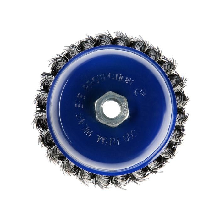 Металлическая кручёная щётка чашечного типа ТУНДРА предназначена для грубой зачистки металлических поверхностей от ржавчины и грязи, удаления неровностей и сглаживания сварных швов. Применяется совместно с угловой шлифовальной машиной, тип крепления - М14.