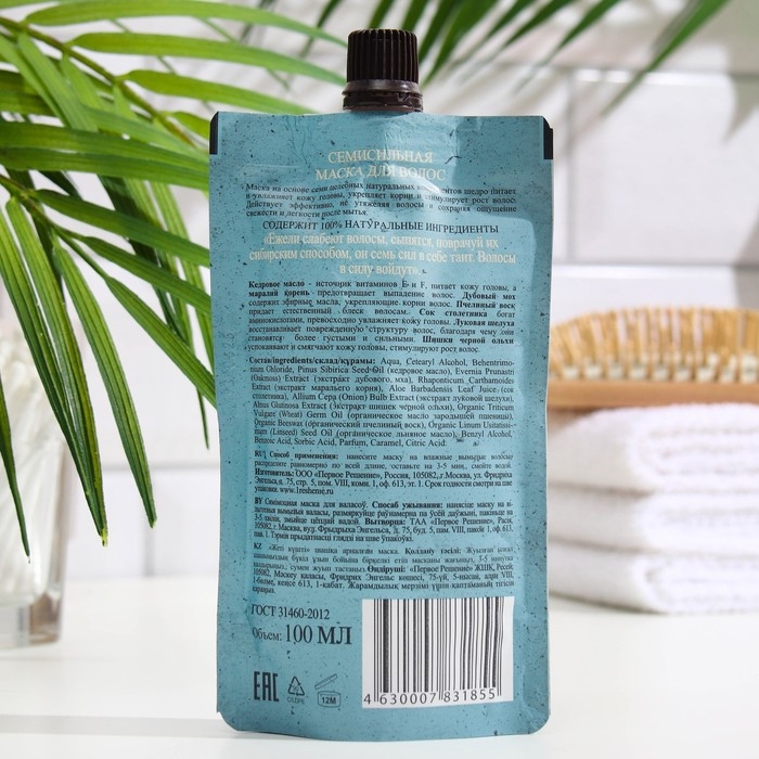 Состав: Aqua, Cetearyl Alcohol, Behentrimonium Chloride, Pinus Sibirica Seed Oil (кедровое масло), Evernia Prunastri (Oakmoss) Extract (экстракт дубового мха), Rhaponticum Carthamoides Extract (экстракт маральего корня), Aloe Barbadensis Leaf Juice (сок столетника), Allium Cepa (Onion) Bulb Extract (экстракт луковой шелухи), Alnus Glutinosa Extract (экстракт шишек черной ольхи), Organic Triticum Vulgare (Wheat) Germ Oil (органическое масло зародышей пшеницы), Organic Beeswax (органический пчелиный воск), Organic Linum Usitatissimum (Linseed) Seed Oil (органическое льняное масло), Benzyl Alcohol, Benzoic Acid, Sorbic Acid, Parfum, Caramel, Citric Acid.