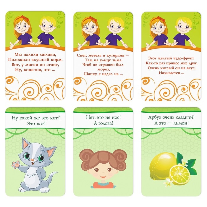На одной стороне карточки вы найдёте весёлую загадку, на другой — ответ. Но есть небольшой подвох: сам вопрос в стихах, а вот правильный ответ с ним не рифмуется.