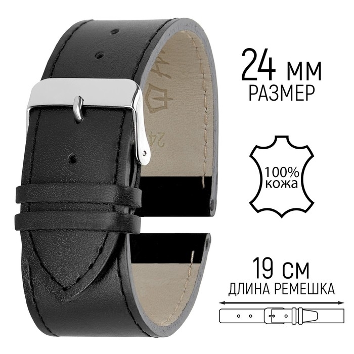 Ремешок для часов, мужской, 24 мм, запряжник 75 мм, горт 115 мм, натуральная кожа, чёрный
