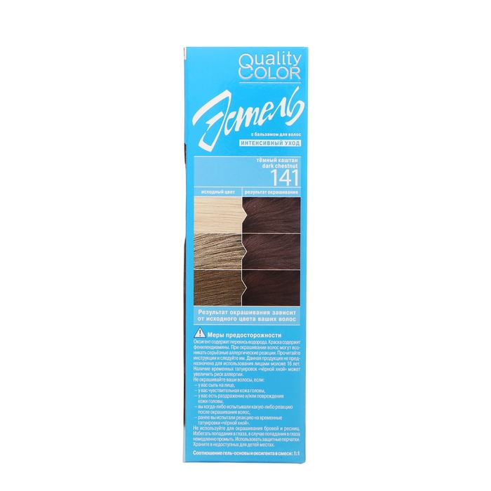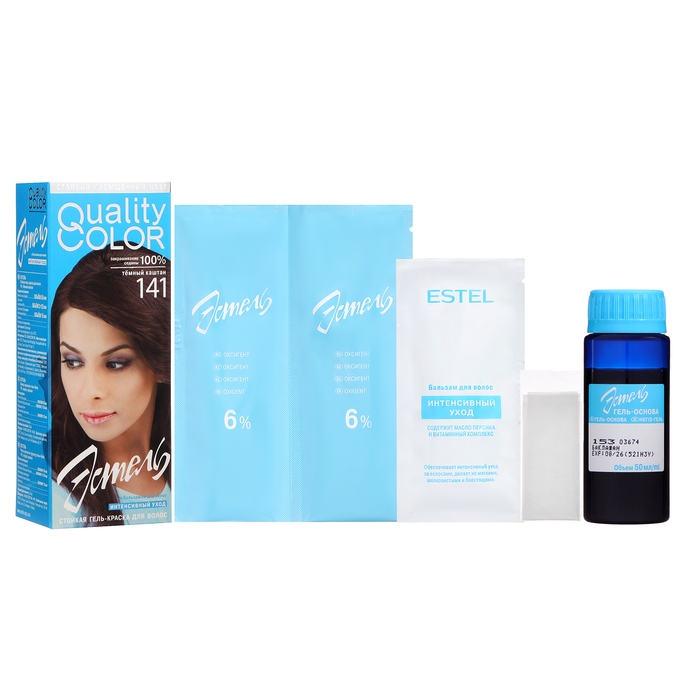 Стойкая гель-краска для волос Estel Quality Color российского бренда Юникосметик. В состав краски входит комплекс витаминов - С, В5, РР, действие которых направлено на укрепление и защиту волос от кончиков до корней. Витаминный комплекс повышает порог сопротивляемости волос к негативным внешним факторам, способствует восстановлению и обновлению клеток волоса. Гелеобразная консистенция краски очень удобна и позволяет проводить окрашивание в домашних условиях.