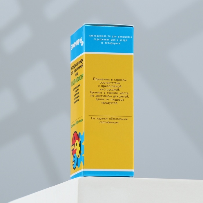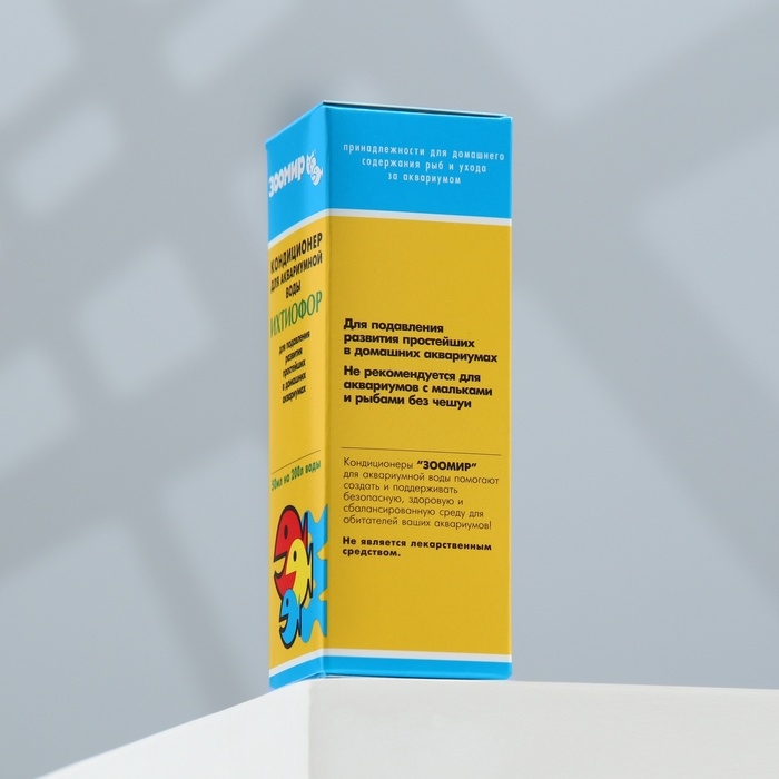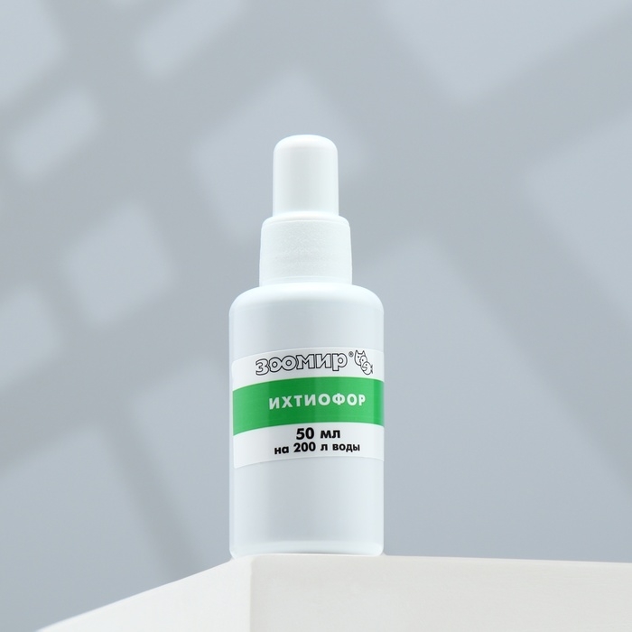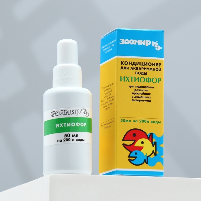 Кондиционер для аквариумной воды «Ихтиофор» 50 мл предназначен для создания безопасной, здоровой среды в пресноводных и морских аквариумах, препятствующей развитию ихтиофтириусов, костий и оодиниум, а также вредных микроорганизмов. Кондиционер представляет собой раствор малахитового зелёного красителя и формалина, которые имеют разный механизм воздействия на простейших, за счёт чего эффективность значительно повышается. Способ применения: Количество кондиционера в 1 флаконе (50 мл раствора) рассчитано для использования в общем аквариуме с объёмом воды 200 л, то есть по 5 мл данного раствора на каждые 20 л аквариумной воды. Определённое количество кондиционера, рассчитанное на весь объём воды в аквариуме, разбавляют свежей отстоявшейся водой в стеклянной посуде ёмкостью 200-250 мл. Затем этот раствор понемногу переливают в аквариум, осторожно перемешивая при этом воду. Во время применения кондиционера необходимо обеспечить постоянную аэрацию. Через день следует производить частичную замену воды (1/3 её объёма), восстанавливая первоначальную концентрацию кондиционера в воде. Длительность обработки воды составляет 1-2 недели. В некоторых случаях на это время полезно повысить температуру воды до 28-30 °С. Рекомендации по применению кондиционера: Средство следует с осторожностью использовать в аквариумах, в которых содержатся рыбы, не имеющие чешуи, мальки, молодь и беспозвоночные. В таких случаях необходимо выбрать другой кондиционер или снизить концентрацию в 2 раза. Средство сохраняет свои свойства после замораживания-размораживания. При пониженной температуре возможно выпадение осадка. Для растворения осадка перед употреблением нагрейте кондиционер до комнатной температуры и энергично взболтайте.