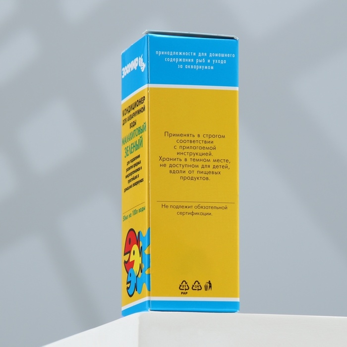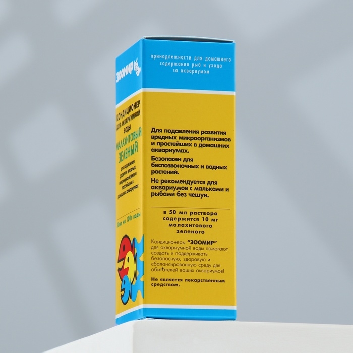 Кондиционер для аквариумной воды «Малахитовый зелёный» 50 мл предназначен для создания и поддержания безопасной среды в аквариуме, препятствующей развитию вредных микроорганизмов и простейших. Кондиционировать воду с его помощью можно только в аквариумах, в которых содержатся взрослые рыбы следующих групп: живородящие и икромечущие карпозубые, лабиринтовые, африканские и американские харациновые, цихловые, карповые (в том числе барбусы, расборы и золотые рыбки декоративных форм). Для аквариума с другими рыбами, особенно не имеющими чешуи, а также для мальков и подростков необходимо выбрать другой кондиционер или снизить концентрацию в 2 раза. Способ применения: В 1 флаконе (50 мл раствора) содержится 10 мг красителя малахитового зелёного. Это количество рассчитано на применение в аквариуме с объёмом воды 100 л, то есть по 5 мл данного раствора на каждые 10 л. Определённое количество кондиционера, рассчитанное на весь объём воды в аквариуме, разбавляют свежей отстоявшейся водой в стеклянном сосуде ёмкостью 200-250 мл. Затем этот раствор постепенно, равными порциями, в три приёма с интервалами 20-30 минут переливают в аквариум, осторожно перемешивая при этом воду. Переливать в аквариум сразу весь раствор недопустимо! Кондиционер вводят в аквариумную воду через каждые 7-10 дней. Перед добавлением кондиционера рекомендуется производить подмену 1/3-1/2 объёма воды в аквариуме. Процесс кондиционирования может длиться до месяца и дольше. Рекомендации по применению: В период кондиционирования воды из аквариума следует удалить биофильтр и фильтр с активированным углём. Температуру воды рекомендуется повысить до 30 °С и поддерживать на этом уровне до окончания процедуры. Для освобождения воды от окрашивания, по окончании кондиционирования применяют фильтры с активированным углём. С осторожностью применять в аквариумах, в которых содержатся беспозвоночные. Кондиционер сохраняет свои свойства после замораживания-размораживания. При пониженной температуре возможно выпадение осадка. Для растворения осадка перед употреблением нагрейте кондиционер до комнатной температуры и энергично взболтайте.