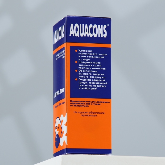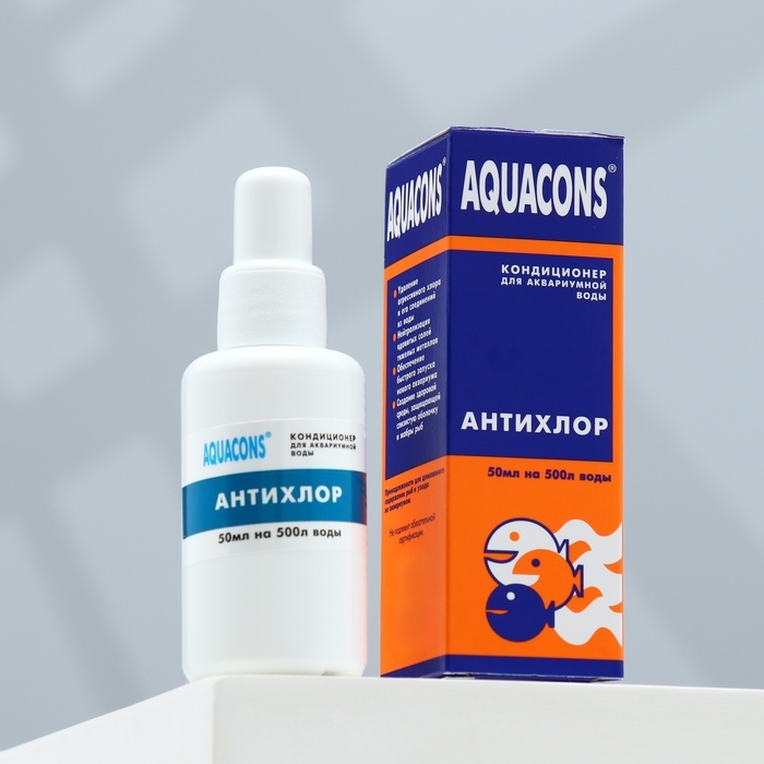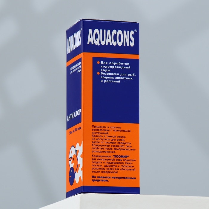 Кондиционер «Акваконс» применяется для быстрого запуска аквариума. Средство удаляет из водопроводной воды агрессивный хлор и его соединения, нейтрализует соли тяжёлых металлов и создаёт безопасную среду в новом доме для рыбок.Обработка исключает повреждение слизистой оболочки и жабр питомцев.Способ применения:Проверьте содержание хлора специальным тест-индикатором (приобретается отдельно).Приготовьте раствор из расчёта 5 мл кондиционера на 50 л воды. Для измерения точного объёма используйте пипетку или шприц. Допускается трёхкратное превышение дозы.Влейте средство в стеклянный сосуд с 200–300 мл отстоявшейся воды. Перемешайте и постепенно в течение 30 минут вылейте жидкость в аквариум. Обеспечьте циркуляцию и аэрацию воды.В рекомендуемом количестве кондиционер безопасен для рыб, культурных растений и других обитателей аквариума.Меры предосторожностиПрименяйте исключительно по назначению и в строгом соответствии с инструкцией.Во время работы со средством не курите и не принимайте пищу.Храните в недоступном для детей, тёмном, прохладном месте и вдали от пищевых продуктовПри попадании на кожу промойте проточной водой.Свойства кондиционера сохраняются после заморозки и разморозки. При пониженной температуре вероятно выпадение осадка. Для его растворения нагрейте средство до комнатной температуры и сильно взболтайте.