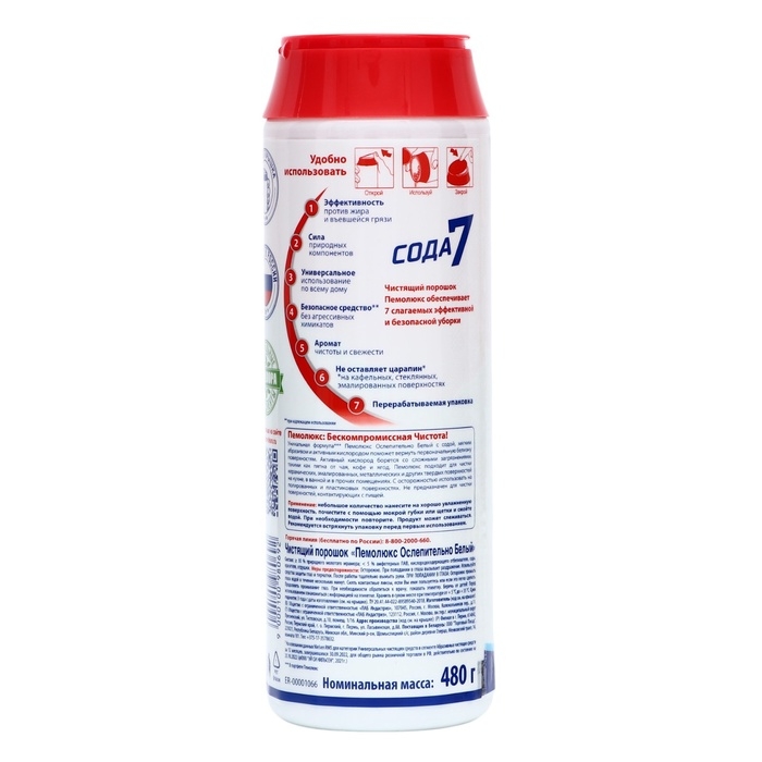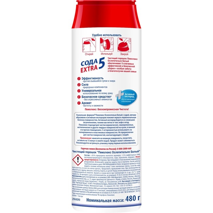 Мощная формула Пемолюкс с содой и мягким абразивом подходит для чистки керамических, эмалированных, металлических и других твердых поверхностей на кухне, в ванной комнате и прочих помещениях. С осторожностью использовать на полированных и пластиковых поверхностях. Не предназначен для чистки поверхностей, контактирующих с пищей.