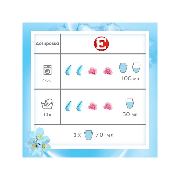 Ополаскиватель для белья Е просто использовать. Благодаря удобной крышке-дозатору Вы всегда будете знать, сколько ополаскивателя для белья необходимо добавить в отделение для кондиционера в стиральной машине или при ручной стирке. Его не нужно разбавлять водой. Перед использованием рекомендуется взбалтывать. Информация по дозировке указана на обратной стороне упаковки