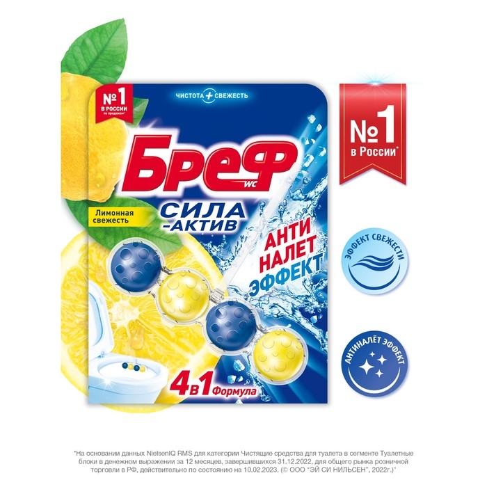 Блок для чистки и свежести унитаза 4 в 1, Bref Сила актив "Лимонная свежесть", 50 г