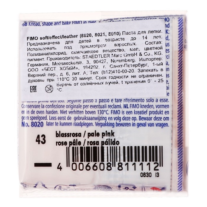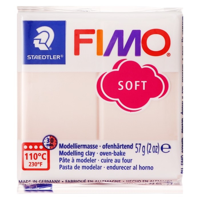 Полимерная глина FIMO подходит для начинающих мастеров и професиональных художников.ОсобенностиМасса мягкая, поэтому вы легко придадите ей нужную форму.Цвета можно смешивать для получения необходимых оттенков, которые сохранятся после обжига.После запекания изделия становятся прочными и долговечными.Упаковка легко открывается без использования ножа. Если вы не полностью израсходовали блок, то остатки можно завернуть в упаковку — так глина лучше сохранится.Термическая обработка. Готовое изделие поместите внутрь духовки на тарелке, стекле или фольге. Температура обжига не должна пpeвышaть 130 °С.Пластика рекомендована для детей старше 8 лет.