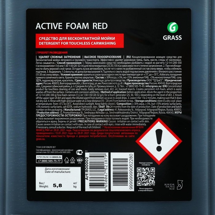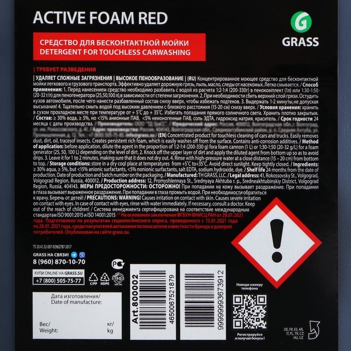 Шампунь для бесконтактной мойки Grass Active Foam Red, 1л (1:30-1:50)