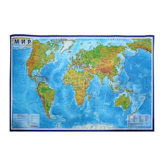 Географическая карта Мира физическая, 101 х 66 см, 1:29 млн, ламинированная настенная