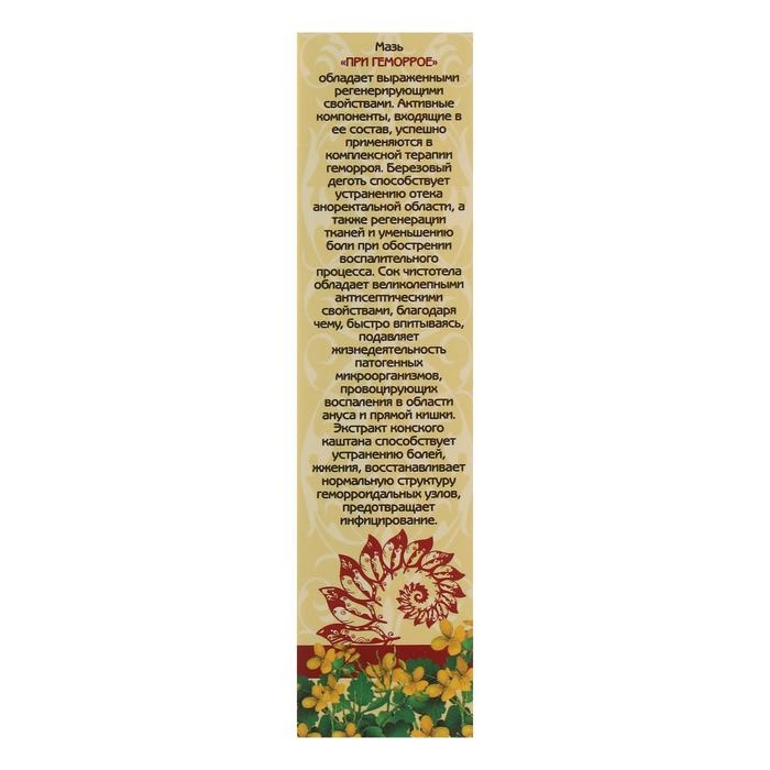 Обладает выраженными регенерирующими свойствами. Активные компоненты, входящие в ее состав, успешно применяются в комплексной терапии геморроя. Березовый деготь способствует устранению отека аноректальной области, а также регенерации тканей и уменьшению боли при обострении воспалительного процесса. Сок чистотела обладает великолепными антисептическими свойствами, благодаря чему, быстро впитываясь, подавляет жизнедеятельность патогенных микроорганизмов, провоцирующих воспаления в области ануса и прямой кишки. Экстракт конского каштана способствует устранению болей, жжения, восстанавливает нормальную структуру геморроидальных узлов, предотвращает инфицирование.