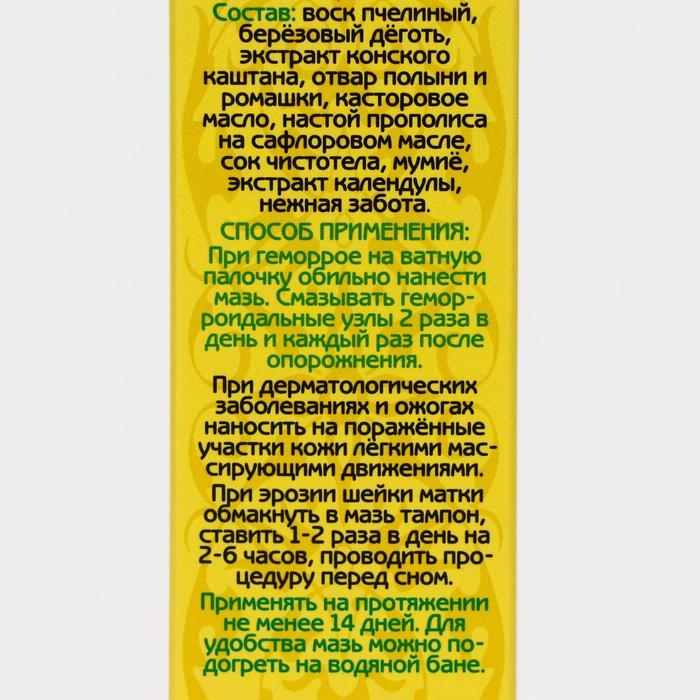 Состав: воск пчелиный, березовый деготь, экстракт конского каштана, отвар полыни и ромашки, касторовое масло, сок чистотела, мумие.