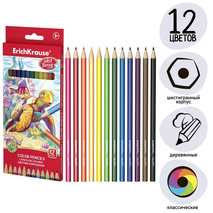 Карандаши 12 цветов ErichKrause ArtBerry премиум, дерево, шестигранные, 3.0 мм грифель, картонная упаковка, европодвес