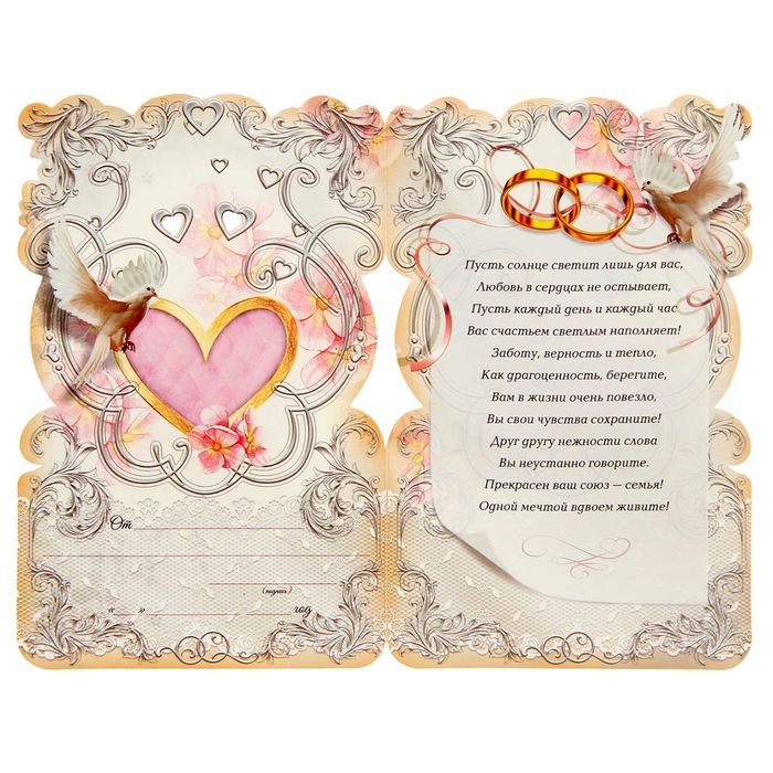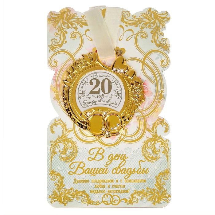 Хотите ярко и необычно поздравить близких людей с годовщиной такого важного дня? Изделие подчеркнёт всю торжественность этого события. Медаль эксклюзивной формы изготовлена из металла под золото и украшена великолепными сияющими стразами. Она преподносится на нежной оригинальной резной открытке с золотым тиснением. Внутри написаны красивые искренние поздравления!