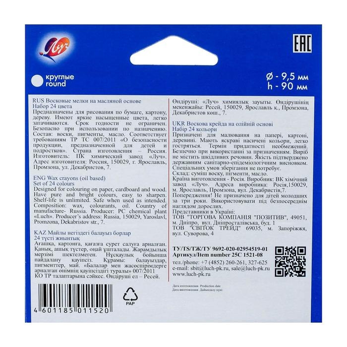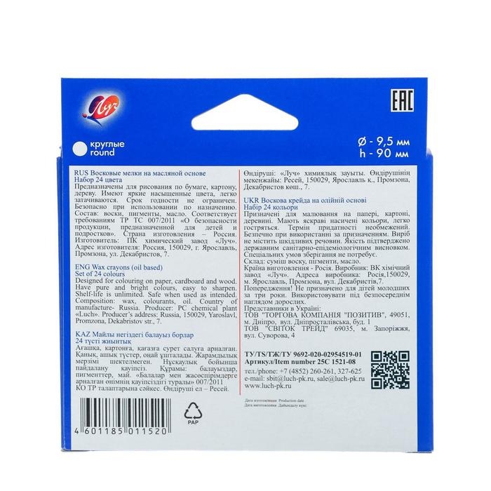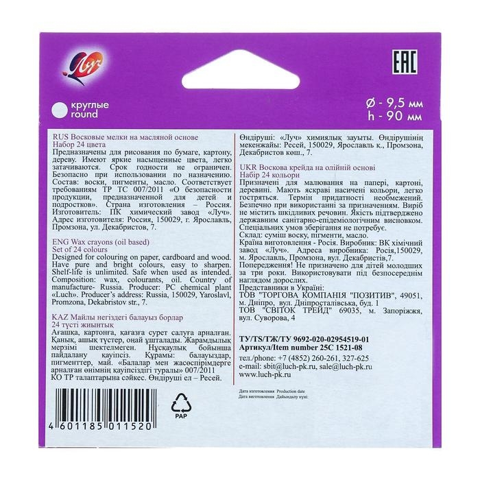 Карандаши восковые 24 цвета, 93 х 8 мм, Calligrata, в картонной коробе