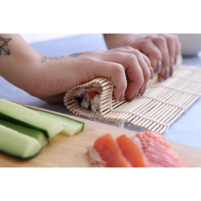 Традиционный инструмент для приготовления суши и роллов – это циновка макису или по-другому бамбуковый коврик. Это простое, но надёжное приспособление, которое поможет сформировать форму блюда.