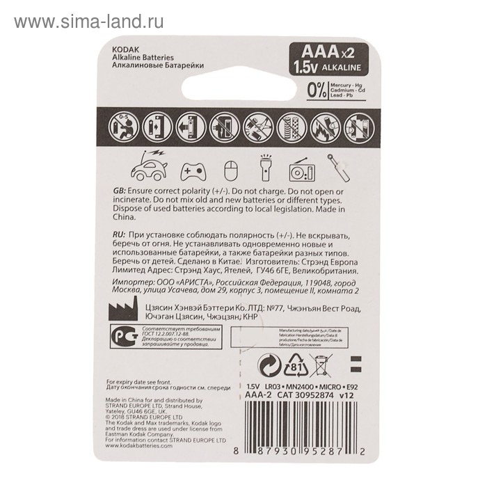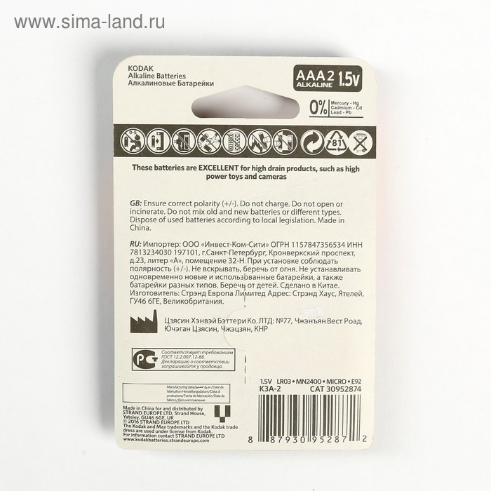 Батарейка алкалиновая Kodak Max, AAA, LR03-2BL, 1.5В, блистер, 2 шт.