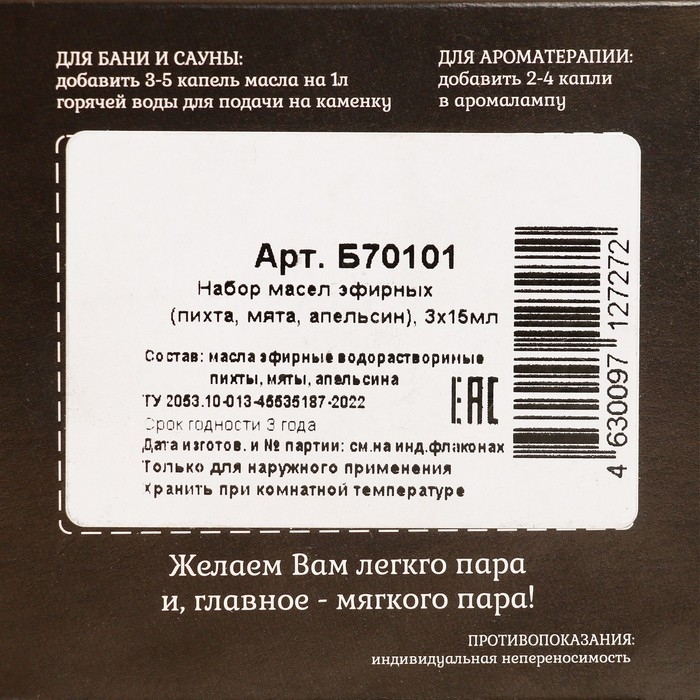 Набор эфирных масел 10 мл "В бане и душа отдыхает" пихта, эвкалипт, можжевельник, мята