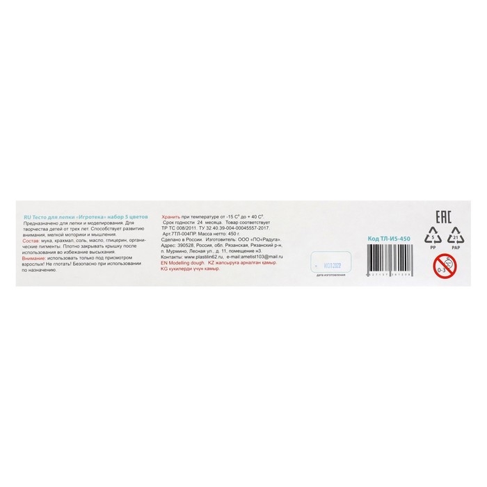 Тесто для лепки, 5 цветов, 450 г, эко на растительной основе, картон отличается яркостью цветов. Они легко смешиваются между собой, образуя насыщенные оттенки. Это делает состав незаменимым при работе с пёстрыми фигурами, развивающими цветовое и абстрактное мышление крохи.