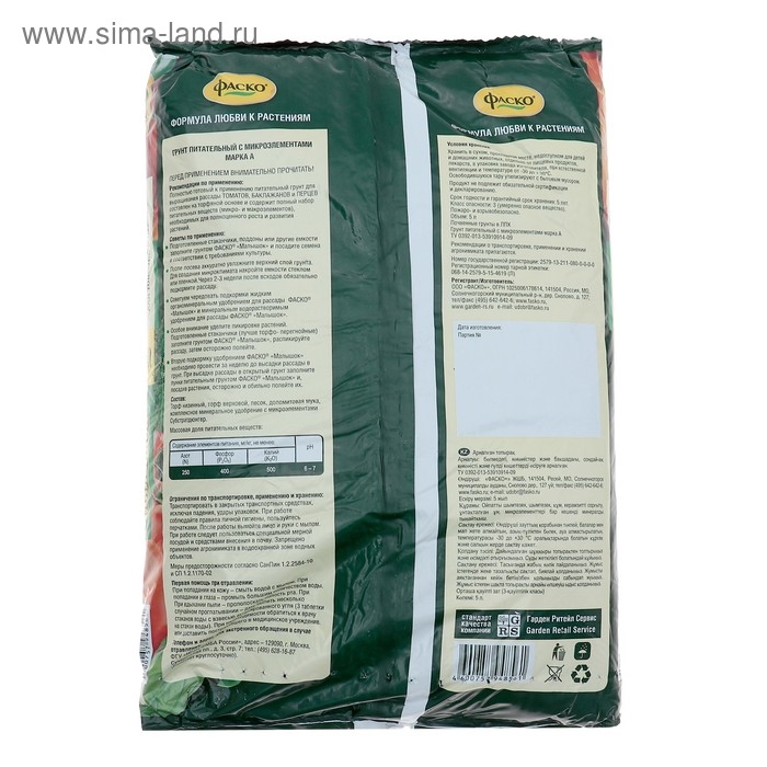 Питательные элементы: Азот – 250 мг/кг; Фосфор – 400 мг/кг; Калий - 500 мг/кг; рН 6-7