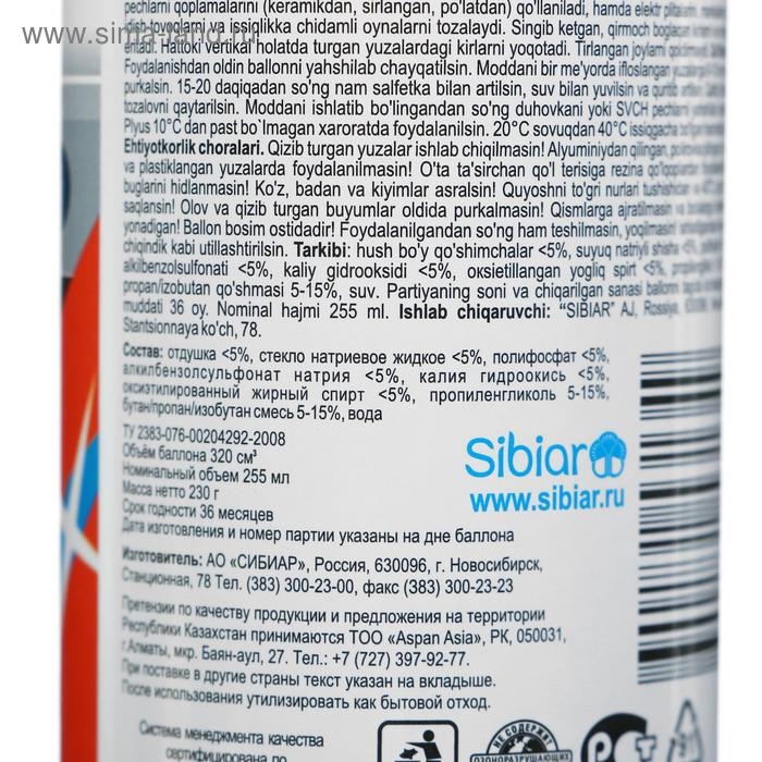Способ применения: перед применением баллон хорошо встряхнуть. Равномерно распылить средство на загрязненную поверхность с расстояния 8-10 см. Через 15-20 минут протереть поверхность влажной салфеткой, смыть водой и вытереть насухо. При сильном загрязнениях процедуру повторить. Духовку или свч-печь после применения средства хорошо проветрить. Использовать при температуре не ниже 10 °C.
