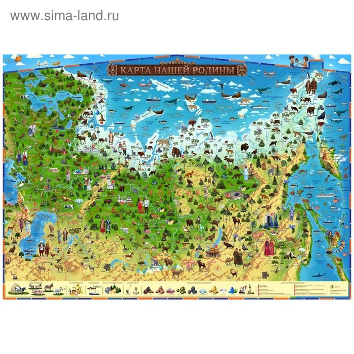 Как рассказать ребенку о нашей необъятной стране? Лучше всего наглядно. На карте можно увидеть представителей народов России и соседних стран, животные и растения, которые можно повстречать на просторах нашей Родины, месторождения полезных ископаемых, национальные достопримечательности и многое другое.