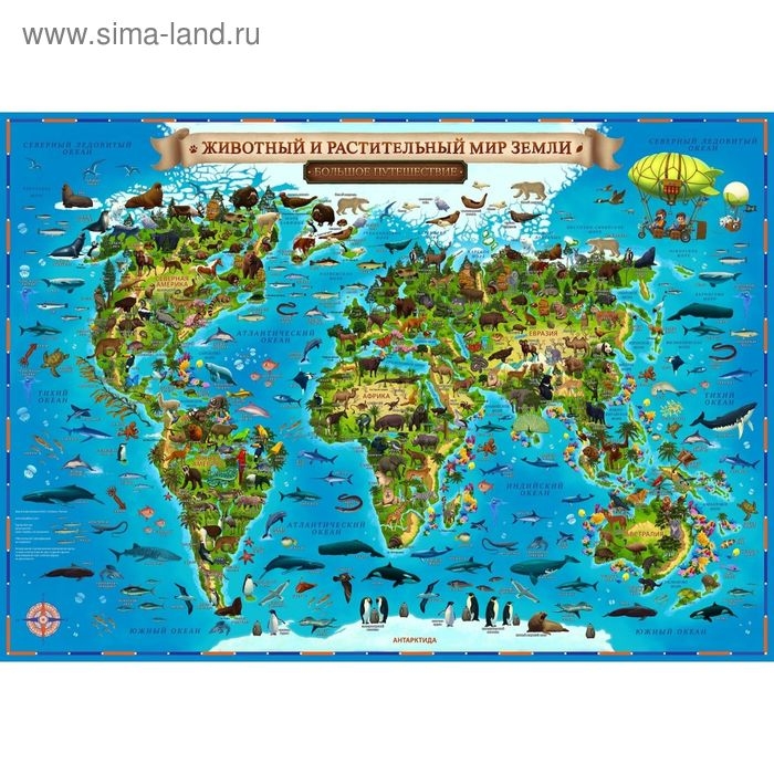 Географическая карта Мира для детей "Животный и растительный мир Земли", 101 х 69 см, без ламинации