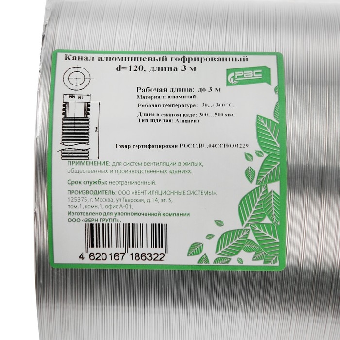 Воздуховод гофрированный "Алювент", d=120 мм, раздвижной до 3 м, алюминиевый