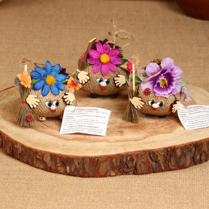Каждый домовёнок уникален и имеет своё значение и смысл. Изготовлены домовые и обереги из природных материалов и по старинным технологиям. Для их создания используют такие материалы как, древесина, мешковина, сизаль, цветы, семечки и другие декоративные элементы. Все эти материалы в особом сочетании приносят успех, достаток, любовь, благополучие, как в домашнее, так и офисное помещение.