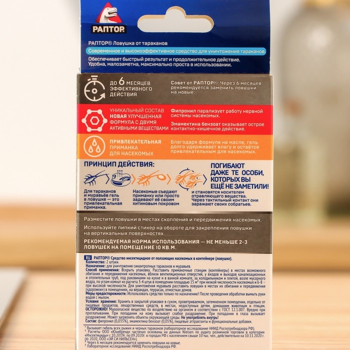 Для тараканов и муравьев гель в ловушке - это привлекательная приманкаНасекомые съедают приманку или просто задевают ее своим хитиновым покровом и становятся носителем отравляющего вещества. Через тактильный контакт они заражают своих собратьев.FIPRONIL (ФИПРОНИЛ) – контактный и кишечный инсектицид широкого спектра действия, обладает умеренными системными свойствами и хорошей остаточной активностью. Высокая кишечная активность и сильное контактное действие позволяют применять фипронил в составе инсектицидных средств в различных средствах по эффективной защите от насекомых.EMMAMECTIN BENZOATE (ЭММАМЕКТИН БЕНЗОНАТ) - инсектицид кишечно-контактного действия. Вещество воздействует на центральную нервную систему насекомого. Это приводит к расслаблению мышц (они не могут сокращаться), через 1–4 часа особи перестают питаться, а в течении 1-4 суток насекомое погибает.Инструкция: Перед использованием ловушки для тараканов проведите тщательную уборку помещения, в том числе в труднодоступных местах. Аккуратно разместите ловушки в местах обитания и передвижения тараканов. Вам понадобятся 2-3 ловушки на помещение площадью 10 м² (при невысокой численности насекомых). Важно! Не используйте аэрозоли от насекомых одновременно с ловушками, т.к. их запах отпугивает тараканов от ловушек. Для более эффективной защиты от тараканов рекомендуется заменить ловушки на новые через 2 месяца использования.