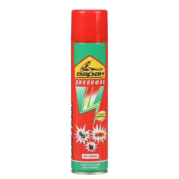 Способ примененияПеред применением дихлофоса «Варан» рекомендуется убрать из помещения растения и домашних животных. Препарат используется при температуре не ниже +10°С. Перед непосредственным применением баллон необходимо встряхнуть.От летающих насекомых. При наличии летающих насекомых (мух, москитов, мошек, комаров) обработку производят, закрыв окна и двери. Средство распыляют в воздух в течение 4-5 с в помещениях, площадь которых менее 20 кв. м, и 10–15 с в комнатах площадью более 25 кв. м. Работу с инсектицидом начинают от окна, двигаясь в сторону двери, распыляя в воздух и в места концентрации насекомых струи аэрозоля.От нелетающих насекомых. При обработке от нелетающих насекомых окна и двери не закрывают. Необходимо направить струю аэрозоля в места обитания и передвижения муравьев, клопов, тараканов с расстояния 17-20 см: за плинтуса, обои, щели в мебели, стенах, полах.После обработки выдерживают 15 минут и хорошо проветривают помещение в течение получаса, открыв окна и двери. После сквозного проветривания влажной тряпкой протирают поверхности, с которыми соприкасается человек и домашние животные.Меры предосторожностиРаботу с дихлофосом без запаха «Варан» необходимо производить в перчатках, очках, маске, закрытой одежде. После дезинфекционных работ следует тщательно помыть руки и открытые места на теле. При подготовке к обработке освободить помещения от людей, животных, растений. Не распылять при открытом огне.СоставТетраметрин – 0,04%Перметрин – 0,4%Пиперонилбутоксид – 0,3%Отдушка – менее 5%Функциональные добавки – менее 5%Бутан/пропан/изобутан смесь – более 30%Растворители – более 30%.
