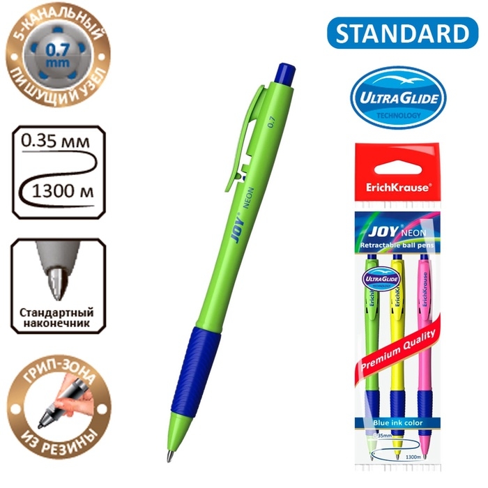 Набор ручек шариковых автоматических 3 штуки Ultra Glide Technology JOY Neon, резиновый упор, узел 0.7 мм, чернила синие, длина линии письма 1300 метров, европодвес