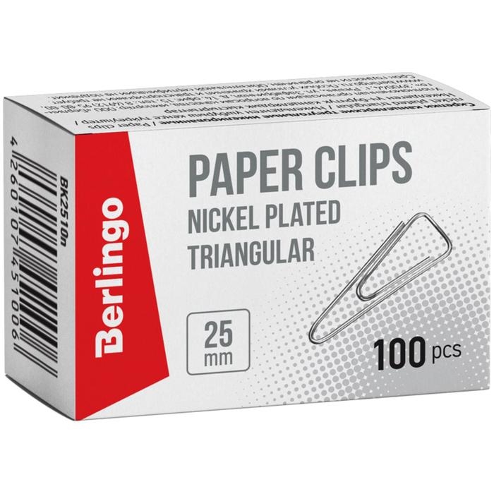 Скрепки никелированные треугольные 25 мм, 100 штук, с отогнутым носиком, картонная упаковка