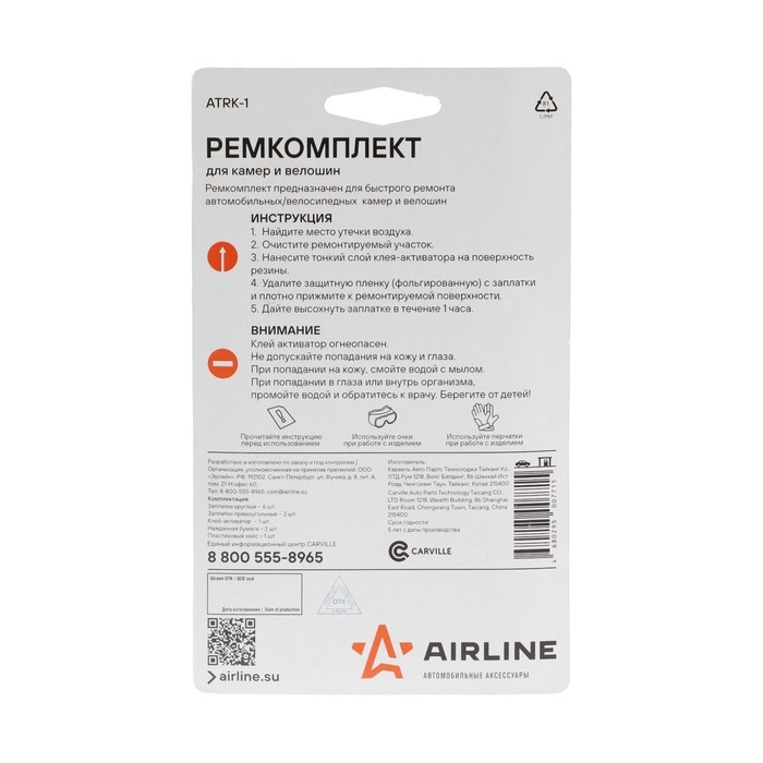 Ремкомплект для камер и велошин Airline ATRK-1 включает в себя наждак для зачистки места прокола, заплатки круглой и прямоугольной формы и клей для их фиксации. Пластиковый кейс позволяет держать все элементы ремкомплекта в одном месте для удобства транспортировки и хранения.