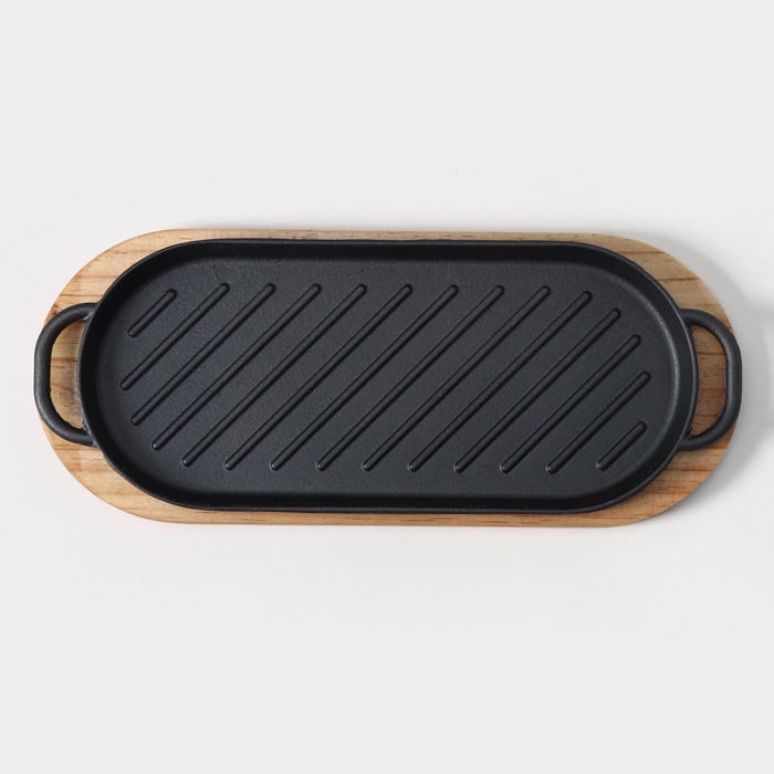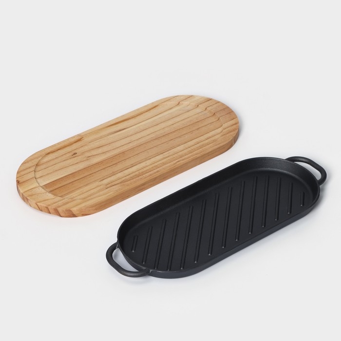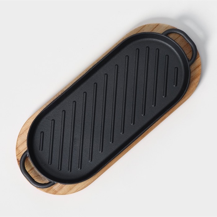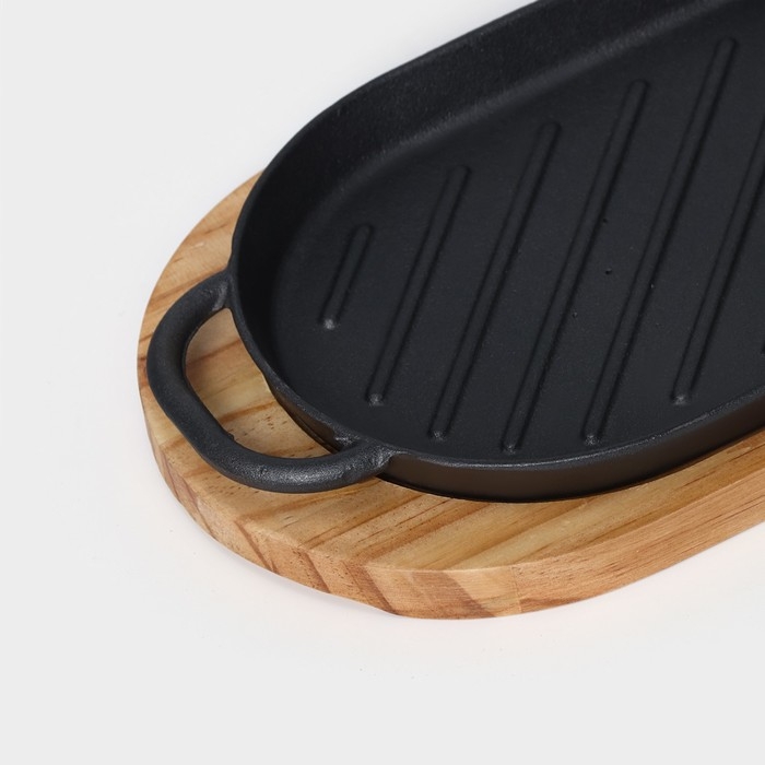 Сковорода чугунная «Овал гриль», 43×16,5×2,5 см, с ручками, на деревянной подставке