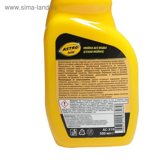 «Сухая мойка» ASTROhim мягко очищает кузов без использования воды, заменяя стандартную мойку с автошампунем. Благодаря мощным поверхностно-активным веществам европейского производства, содержащимся в составе, «Сухая мойка» ASTROhim отлично справляется с дорожными загрязнениями, масляной пленкой, остатками от насекомых и прикипевшей пылью от колодок. Кроме того, состав содержит специальные диспергирующие вещества, которые обволакивают частицы грязи и поддерживают их во взвешенном состоянии, предотвращая появление царапин на лакокрасочном покрытии.