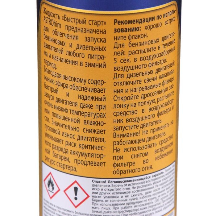 Жидкость для быстрого старта Astrohim предназначена для облегчения запуска бензиновых и дизельных двигателей любого литража и назначения в зимний период. Благодаря высокому содержанию эфира обеспечивает быстрый и надёжный запуск двигателя даже при очень низких температурах или повышенной влажности. Значительно снижает пусковой износ двигателя, уменьшает риск критического разряда аккумуляторной батареи, продлевает ресурс стартера.