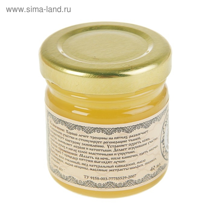 Состав: воск пчелиный, мёд натуральный кавказский, масло облепиховое, масло лещины, масляные экстракты шалфея, зверобоя, ромашки.