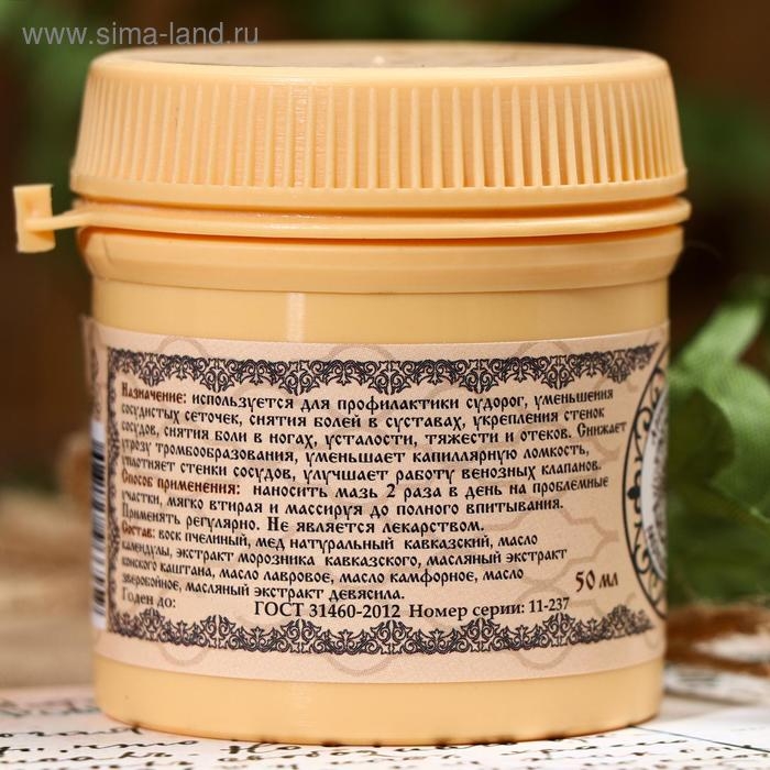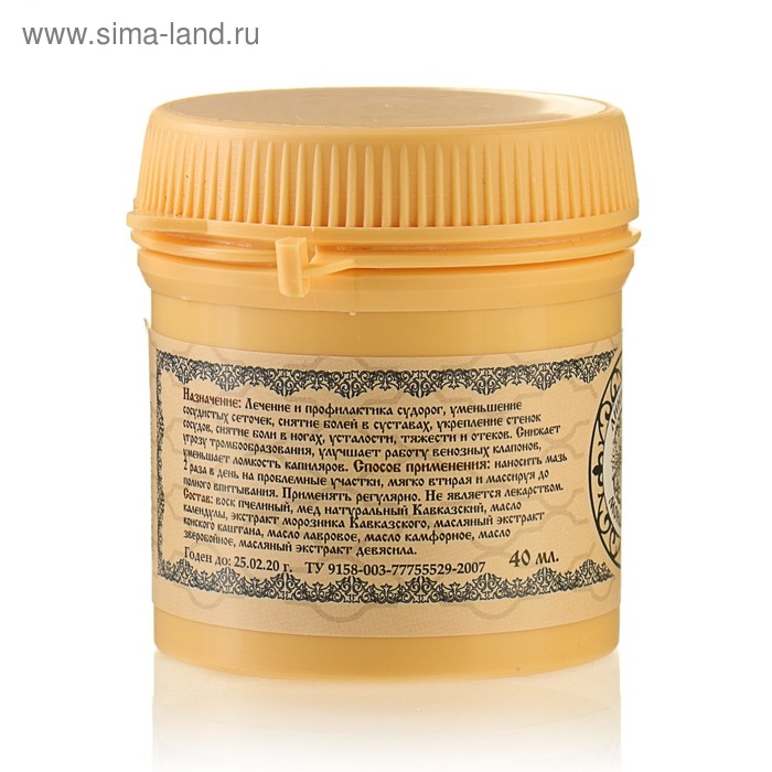 Состав: воск пчелиный, мёд натуральный Кавказский, масло календулы, экстракт морозника Кавказского, масляный экстракт конского каштана, масло лавровое, масло камфорное, масло зверобойное, масляный экстракт девясила.
