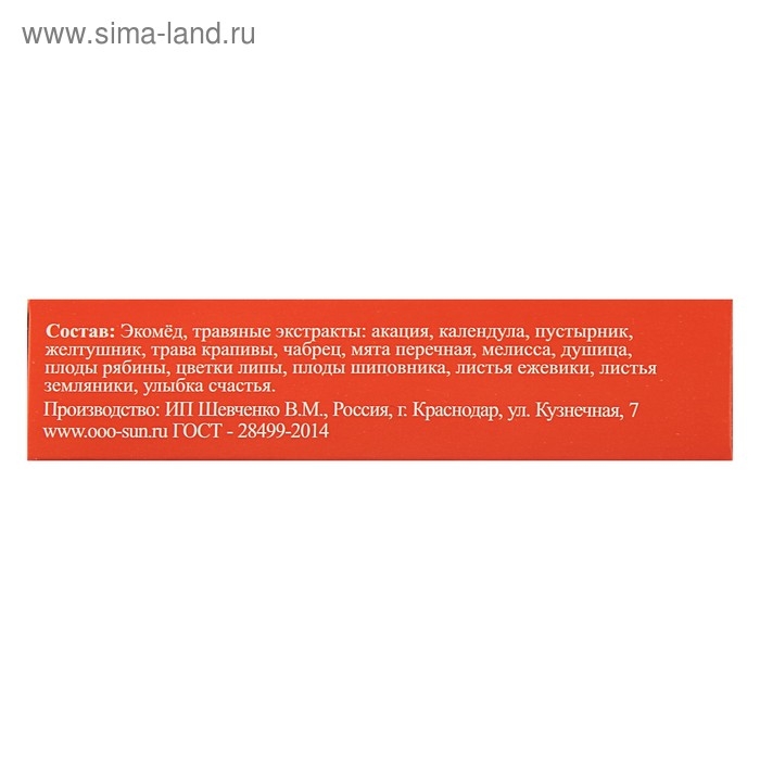 Состав: горный мёд, медовые экстракты: акация, календула, пустырник, желтушник, трава крапивы, чабрец, мята перечная, мелисса, душица, плоды рябины, цветки липы, плоды шиповника, листья ежевики, листья земляники.