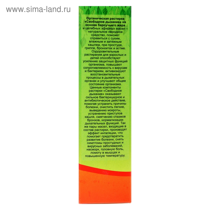 Органическая растирка «Свободное дыхание» изготовлена на основе барсучьего жира и целебных эфирных масел. Она справится с сухим, влажным и затяжным кашлем, поможет при простуде, гриппе, бронхитах и астме.