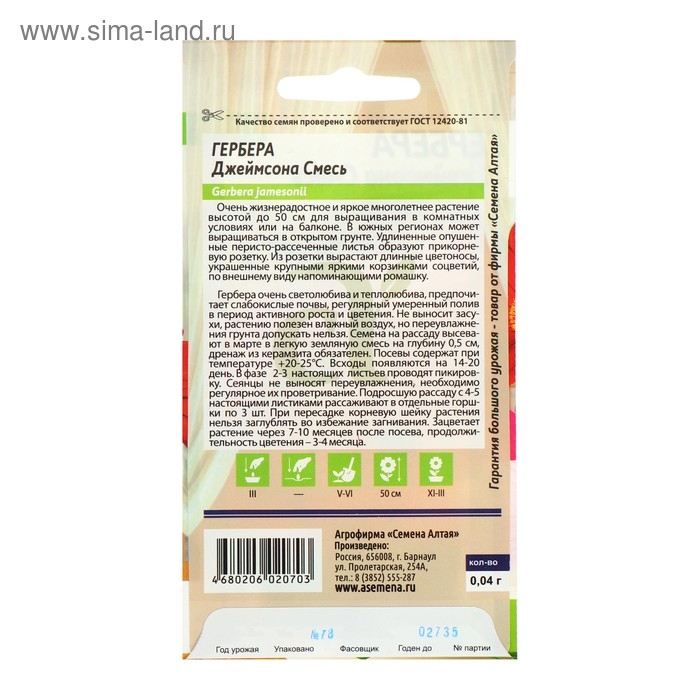 Семена комнатных цветов Гербера Джемсона "Cмесь", ц/п, 0,03 г
